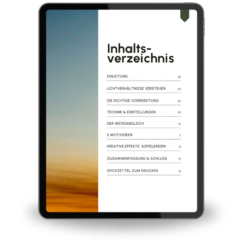 Von der richtigen Vorbereitung über technische Einstellungen bis hin zu kreativen Effekten: hier bekommst Du alles, was Du brauchst, um Deine Motive stimmungsvoll und lebendig einzufangen. Dazu warten praktische Motivideen, ein Spickzettel zum Ausdrucken sowie Tipps, wie Du typische Fehler vermeidest und das Beste aus dem warmen Licht herausholst.